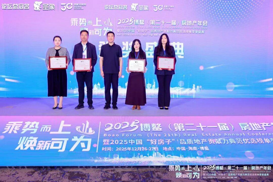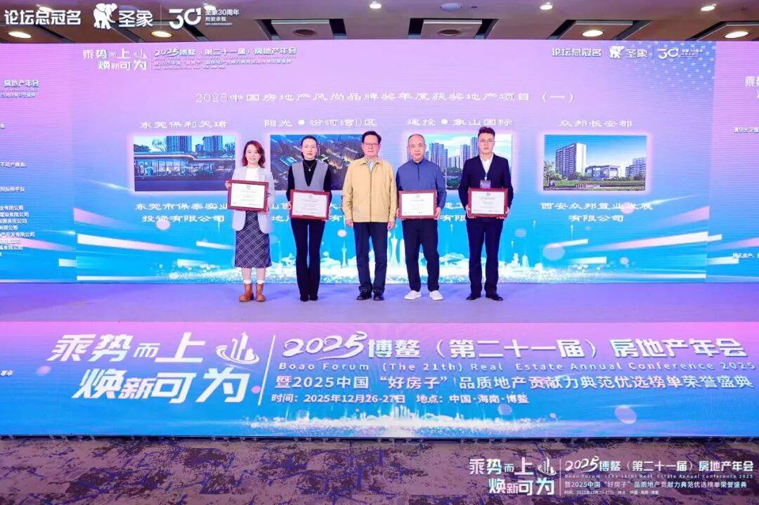 年会主题论坛结束后,发布了2025年度房地产风尚品牌奖入围项目、企业和企业家获选榜单,他们分别是:东莞市保泰实业投资有限公司开发的“东莞保利天珺”;山西阳光大地集团房地产开发有限公司开发的“阳光·汾河湾D区”;湖南建工置业投资有限公司开发的“建投·象山国际”;西安众邦置业发展有限公司开发的“众邦长安郡”;武汉清能瑾诚置业有限公司开发的“清能锦城·缦云观樾”;杭州安居三墩城市发展有限公司开发的“阅仕府”;安徽名邦置业(集团)有限公司开发的“名邦·公园一品”;兰州润兰之城生态建设有限公司开发的“兰州润兰之城小区建设项目”;东莞市泓樾实业投资有限公司开发的“东莞首铸鹭湾”;北京首怡科新置业有限公司开发的“元玺”;中建玖合开发的“中建·玖上琅宸”;山西阳光大地集团房地产开发有限公司开发的“金地·汾河湾五号院”;广东华顺达贸易发展有限公司开发的“新福港鼎峰江畔”;深圳霸联投资有限公司开发的“御公馆”;昆山中源房地产开发有限公司开发的“东方国际广场”。