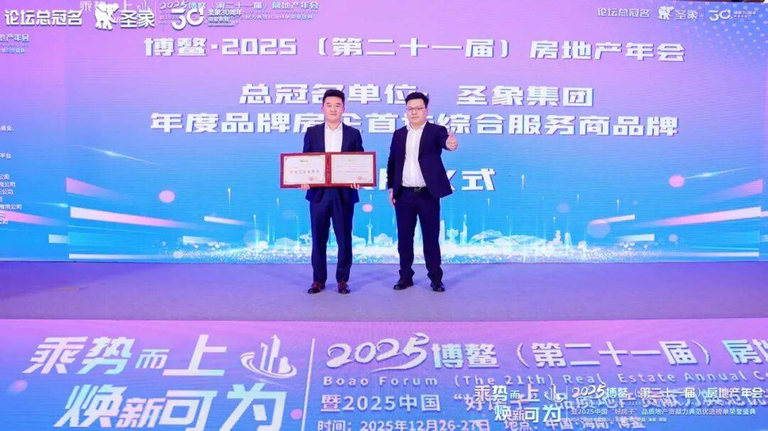 仪式最后,揭晓了本届年会总冠名单位和年度品牌房企首选综合服务商,他是圣象集团;圣象集团作为深度参与中国美好人居建设的核心力量,以总冠名方身份亮相本届年会。圣象不仅是会议的参与者,更是以全产业链实力,致力于成为开发商伙伴在“品质焕新”道路上的坚实同盟。不止于聆听,更在于携手行动,共同“乘势而上”,将“好房子”的蓝图,变为触手可及的现实。最后再次感谢圣象集团的大力支持。
