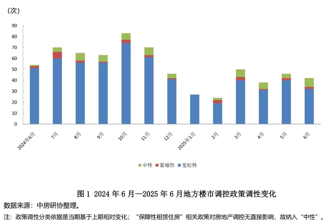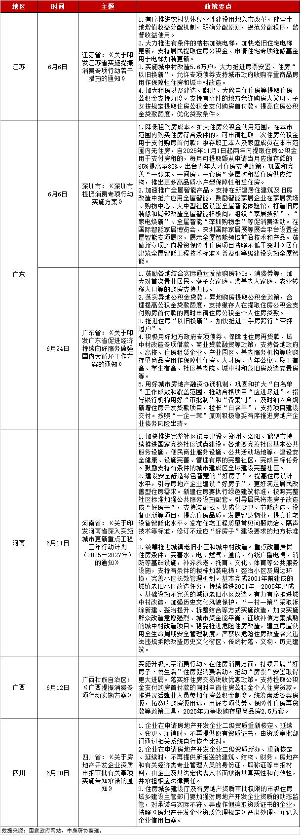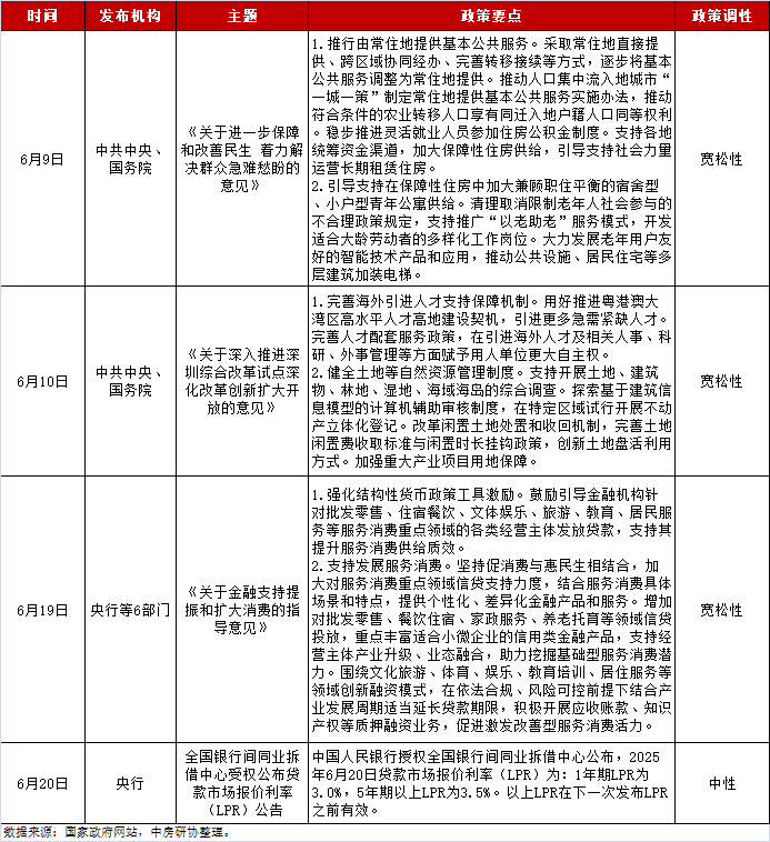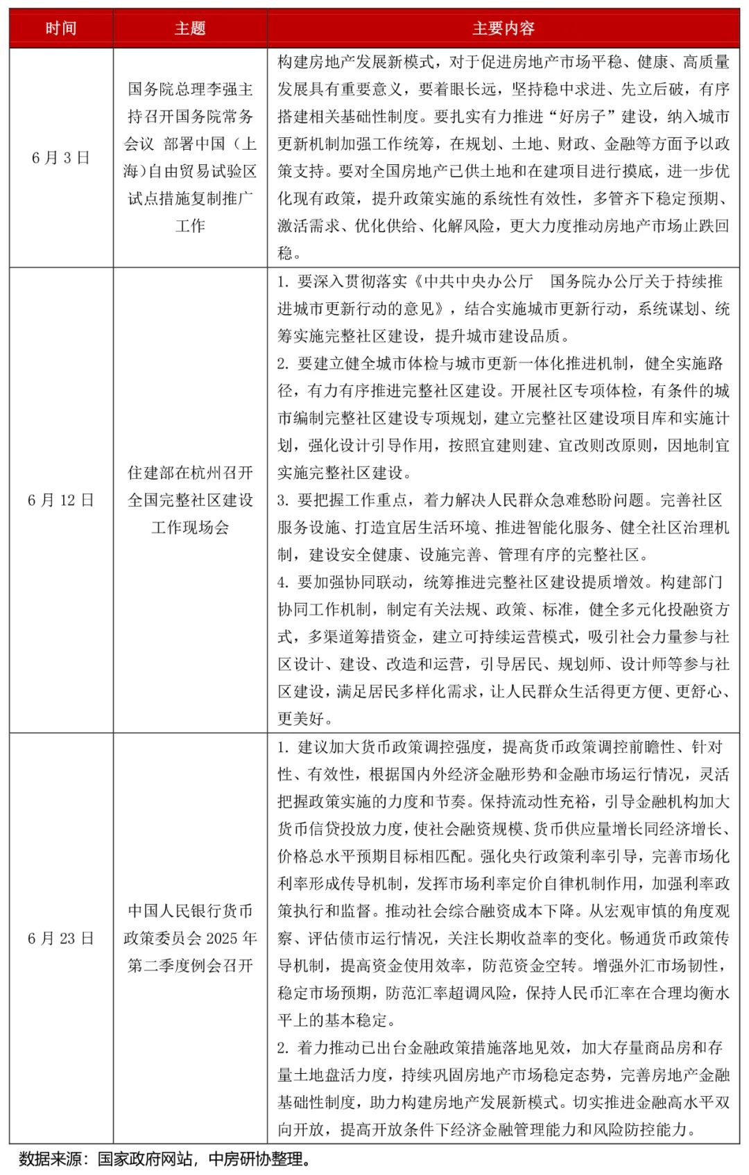 2025年6月,我国房地产政策环境延续宽松。中央层面,国常会定调要进一步优化现有政策,提升政策实施的系统性有效性,更大力度推动房地产市场止跌回稳;中共中央、国务院发文支持各地统筹资金渠道,加大保障性住房供给,引导支持社会力量运营长期租赁住房等,进一步释放政策加力的积极信号。