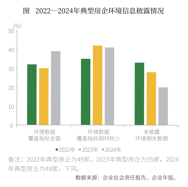 在披露指标的口径方面,房企间环境数据统计范围仍存在较大差距,无法有效体现房企经营过程中的温室气体排放总量、废弃物排放量、耗水量等信息。
