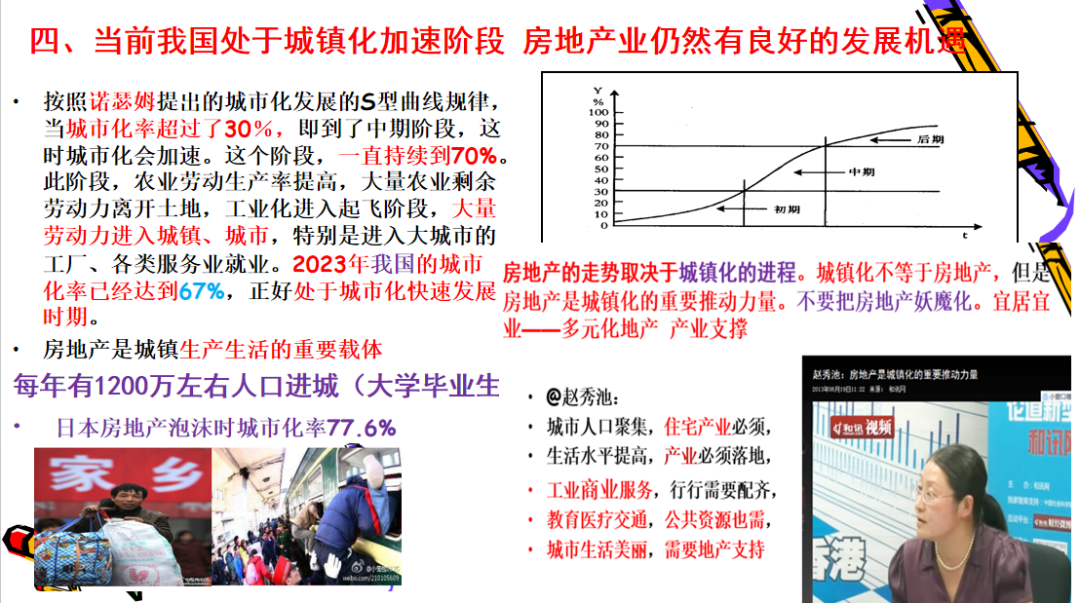 还有城镇化的角度仍然处于城镇化的中期阶段,30%到70%是中期,上涨的速率还是比较高的,农村人口进城还是比较多的。当前最新的数据,城市化的,应该是2024年,城市化率67%,没有到70%。即使到70%之后,北京现在城市化率87%没有问题的,农村人口不断进城的。日本发生房地产泡沫的时候,注意一下是77.6%,目前咱们是67%,起码还有十个点的增长。因为日本泡沫的时候77.6%,城镇没有新增人口,房子卖给谁。咱们不存在这个问题。而且房子不光住的问题,它提供了产业的空间,工业商业等等,包括教育医疗的配套,所以城市人口聚集,住宅产业必须。生活水平提高,产业比较落地。工业商业服务,行行需要配齐,教育医疗交通目前,公共资源也需。城市生活美丽,需要地产支持。房地产对整个城市有巨大的贡献的,这是要看到的。当然各地因城施策,发展差异比较多。