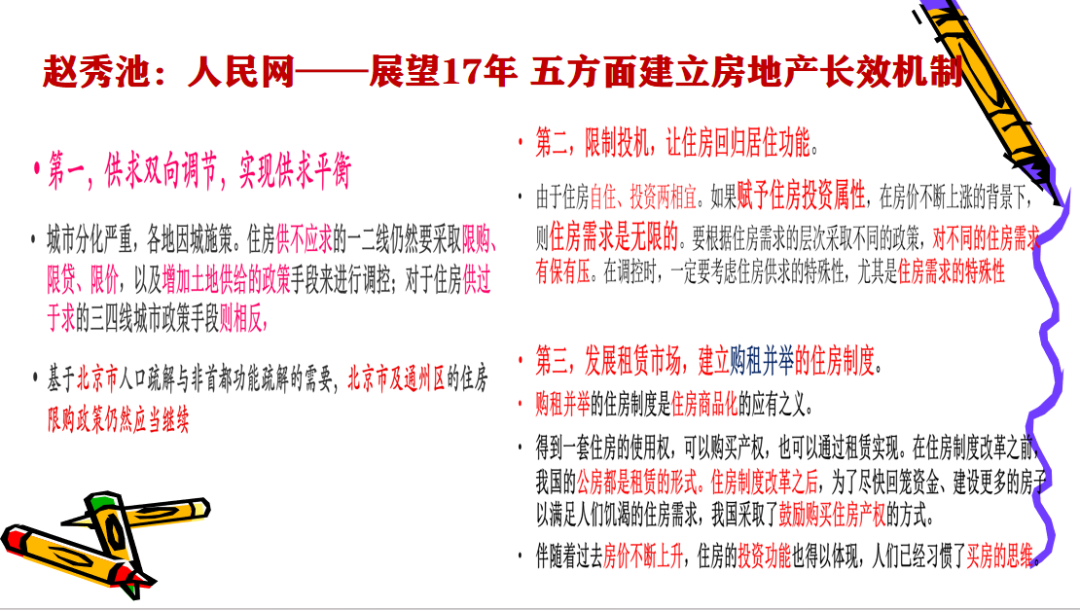 这是我提出的16个方针,**个新城开发、旧城改造和城市关心的锻造;第二个新建住房和存量住房的关系;第三个租赁住房和产权房的关系;第四保障和商品房的关系;第五住房非住房关系;第六土地供应与房屋供应的关系;第七房地产和金融的关系,第八房地产和城镇化的关系;第九人口与房地产的关系,第十住房消费投资、投机的关系;第十一机构租赁个人租赁的关系;第十二轻资产和重资产租赁关系;第十三城市与区域平衡发展的关系;第十四房地产税和房地产发展的关系;十五房地产平衡发展与房价的关系;十六预售和限售的关系。基于房地产发展需要解决的问题比较多,给大家一个预期吧。今天就跟大家分享这么多。