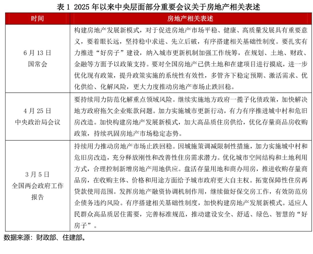 2025年二季度房地产市场综述/ /01/ /政策环境:稳定宽松1.中央层面:提升政策实施的系统性、有效性,更大力度推动房地产市场止跌回稳2025年第二季度,房地产行业政策持续优化。中央层面延续“稳预期、促需求、优供给、降风险”的工作主线,政治局会议和国务院常务会议先后提出“持续巩固···