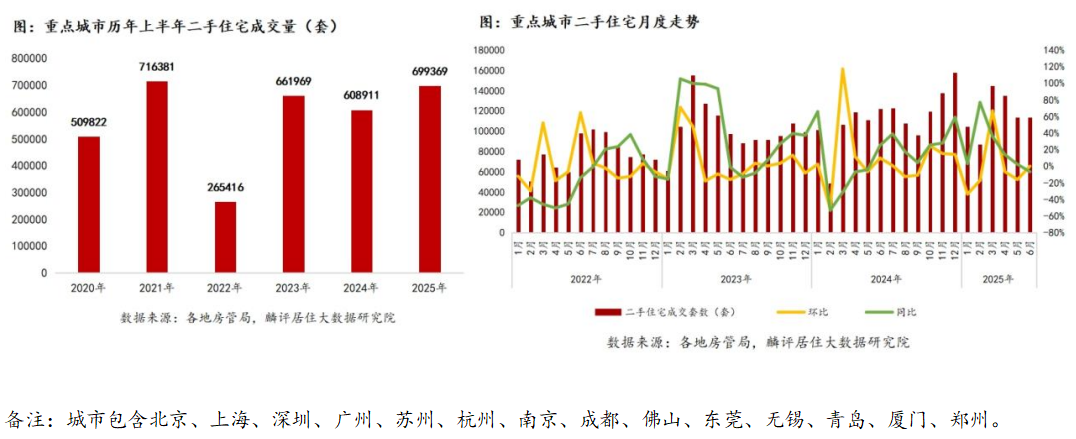 报告|重点城市上半年二手房量升价跌,购房成本继续下降2025年上半年,二手房市场在一系列政策的带动下,成交表现较为可观。 麟评居住大数据研究院监测数据显示,上半年重点14城成交量为699369套,较去年同期上升14.9%,创2022年以来同期新高,成交水平处于历史中高位水平。 报告指出,上半年二手房成交量呈现···