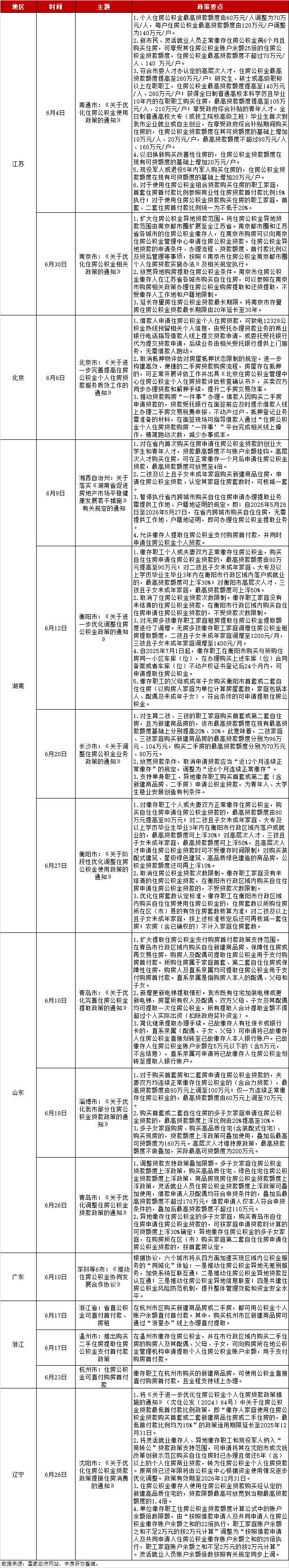 在住房公积金政策支持方面,核心举措主要包括上调公积金最高贷款额度、放宽公积金申请限制等。典型代表有:南通将个人住房公积金最高贷款额度由60万元提高至70万元,将家庭住房公积金最高贷款额度由120万元提高至140万元,并给予高层次人才、现役军人或退役5年内军人、以旧换新购买改善性住房人群额外贷款额度支持;南京将住房公积金异地贷款范围由南京市都市圈扩展至全江苏省,同时放宽异地购房提取公积金条件,不受缴存人工作地和户籍限制,将存量房住房公积金贷款最长期限由20年延长至30年等;长沙将申请住房公积金贷款应当“近12个月连续正常缴存”放宽至“近6个月连续正常缴存”,支持单身职工、异地缴存职工购买首套或二套申请公积金贷款,提高二孩、三孩家庭最高贷款额度等。