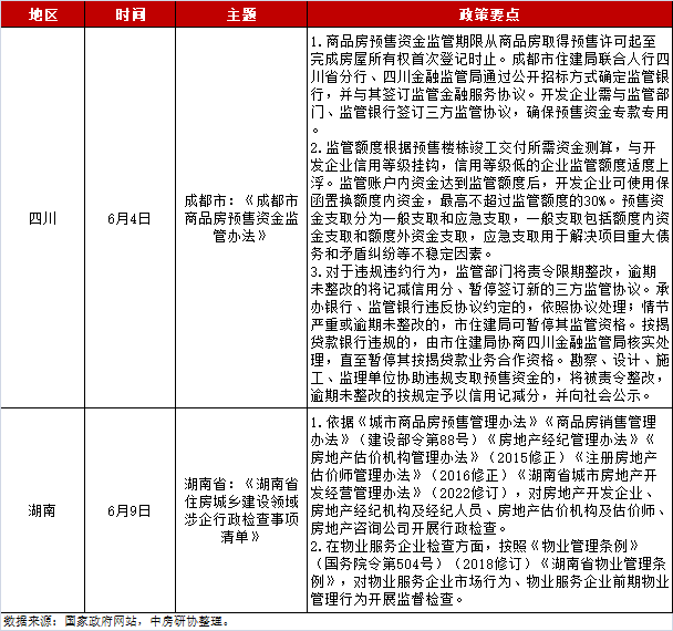 紧缩性政策主要涉及商品房预售资金监管、住建领域从业主体监督检查等。典型代表有:成都发布商品房预售资金监管办法,明确开发企业需与监管部门、监管银行签订三方监管协议,确保预售资金专款专用,监管期限从商品房取得预售许可起至完成房屋所有权首次登记时止;湖南发布住房城乡建设领域涉企行政检查事项清单,对房地产开发企业、房地产经纪机构及经纪人员、房地产估价机构及估价师、房地产咨询公司、物业服务企业市场行为等开展监督检查。