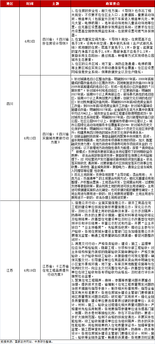 地方层面,本月地方出台房地产调控政策42条,其中,宽松性政策32条、中性政策8条、紧缩性政策2条。地方政策需求侧与供应侧双轨并进,重点聚焦加大住房公积金政策支持、发放购房补贴、深化房地产金融支持、持续推进“好房子”建设等。本期报告主要对6月房地产行业政策进行梳理,并作解析。