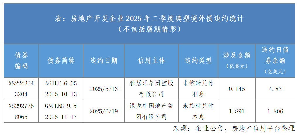 境外债方面,二季度有2家房地产开发企业出现境外债实质性违约(不包括展期情形),涉及债券2只,同比减少71.42%;环比2025年**季度减少33.33%。涉及违约金额共计约2.037亿美元,同比减少49.20%,环比2025年一季度增加284%;涉及债务余额共计6.636亿美元,同比减少73.08%,环比2025年**季度增加143.61%。